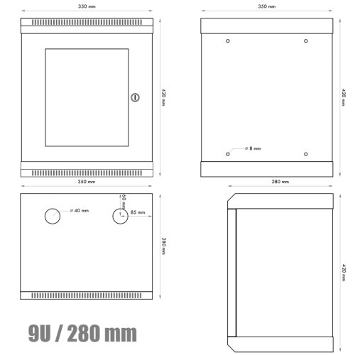 Vlastnosti *vonkajšie rozmery: (v) 420 mm x(š) 350 mm x (h) 280 mm *maximálne odporúčané zaťaženie 15 kg *váha rozvádzača 7,4 kg *farba šedá *zamykateľné plechové dvere s plexisklo výplňou