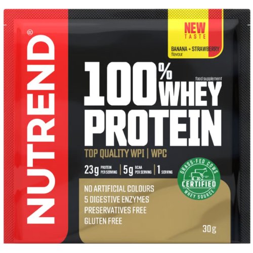 Z tých najkvalitnejších surovín vymiešal Nutrend koktail rôznych jedinečných príchutí, ktoré vás svojou skutočnosťou neprestanú šokovať. V každom 100% Whey Protein je až 23 g bielkovín v jednej dávke, 5 g CAA v jednej dávke. Maximálnu efektivitu tréningu vám zaistí technológia CFM, vďaka ktorej si bielkoviny zachovajú všetky biologicky účinné zložky. Základ produktu tvorí prémiový filtrovaný koncentrát mliečnej srvátky (WPC) spolu s najčistejšou formou izolátu srvátkovej bielkoviny (WPI). Ideálne pre tých, ktorí radi skúšajú nové príchute každý deň a nepotrebujú veľké balenie. Surovina INSTANT WHEY zaisťuje perfektnú rozpustnosť proteínu pre dokonalý komfort prípravy vášho proteínového nápoja. Srvátka použitá pri výrobe je získaná z mlieka hovädzieho dobytka, ktorého strava sa skladá minimálne 90 % z čerstvej trávy alebo krmovín, a ktorého pobyt na voľných pastvinách je samozrejmosťou. Zloženie a nutričné hodnoty na stiahnutie v prílohe. Odporúčané dávkovanie: Dávku 30 g rozmiešajte v 250 ml vody. V závislosti od dennej potreby bielkovín konzumujte 1–3 porcie denne, medzi jedlami. Maximálne 3 dávky denne. Neprekračujte odporúčané dávkovanie. Použitie: 1 odmerka = cca 15 g. Podľa odporúčaného dávkovania odmerajte a rozmiešajte v šejkri. Po otvorení skladujte pri teplote do 25 ºC a spotrebujte do 3 mesiacov. Upozornenie: Doplnok stravy, so sladidlami. Nenahrádza pestrú stravu. Nie je určené pre deti do 12 rokov. Ukladajte mimo dosahu detí. Chráňte pred teplom, mrazom a vlhkosťou. Dodávateľ: NUTREND DS ., as ., Chválkovice 604, 779 00 Olomouc, Česká republika