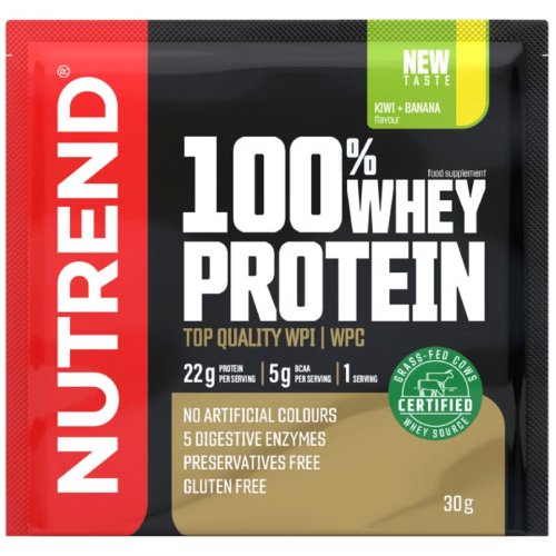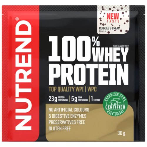 Z tých najkvalitnejších surovín vymiešal Nutrend koktail rôznych jedinečných príchutí, ktoré vás svojou skutočnosťou neprestanú šokovať. V každom 100% Whey Protein je až 23 g bielkovín v jednej dávke, 5 g CAA v jednej dávke. Maximálnu efektivitu tréningu vám zaistí technológia CFM, vďaka ktorej si bielkoviny zachovajú všetky biologicky účinné zložky. Základ produktu tvorí prémiový filtrovaný koncentrát mliečnej srvátky (WPC) spolu s najčistejšou formou izolátu srvátkovej bielkoviny (WPI). Ideálne pre tých, ktorí radi skúšajú nové príchute každý deň a nepotrebujú veľké balenie. Surovina INSTANT WHEY zaisťuje perfektnú rozpustnosť proteínu pre dokonalý komfort prípravy vášho proteínového nápoja. Srvátka použitá pri výrobe je získaná z mlieka hovädzieho dobytka, ktorého strava sa skladá minimálne 90 % z čerstvej trávy alebo krmovín, a ktorého pobyt na voľných pastvinách je samozrejmosťou. Zloženie a nutričné hodnoty na stiahnutie v prílohe. Odporúčané dávkovanie: Dávku 30 g rozmiešajte v 250 ml vody. V závislosti od dennej potreby bielkovín konzumujte 1–3 porcie denne, medzi jedlami. Maximálne 3 dávky denne. Neprekračujte odporúčané dávkovanie. Použitie: 1 odmerka = cca 15 g. Podľa odporúčaného dávkovania odmerajte a rozmiešajte v šejkri. Po otvorení skladujte pri teplote do 25 ºC a spotrebujte do 3 mesiacov. Upozornenie: Doplnok stravy, so sladidlami. Nenahrádza pestrú stravu. Nie je určené pre deti do 12 rokov. Ukladajte mimo dosahu detí. Chráňte pred teplom, mrazom a vlhkosťou. Dodávateľ: NUTREND DS ., as ., Chválkovice 604, 779 00 Olomouc, Česká republika