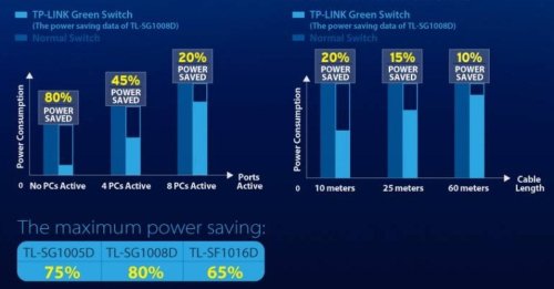 Tento switch TL-SF1016D Fast Ethernet novej generácie je vybavený najnovšími technológiami pre úsporu energie, ktoré výrazne rozširujú kapacitu vašej siete pri oveľa nižšej spotrebe energie. Automaticky upravuje spotrebu energie podľa stavu pripojenia a dĺžky kábla a zmenšuje tak karbónovú stopu vašej siete.