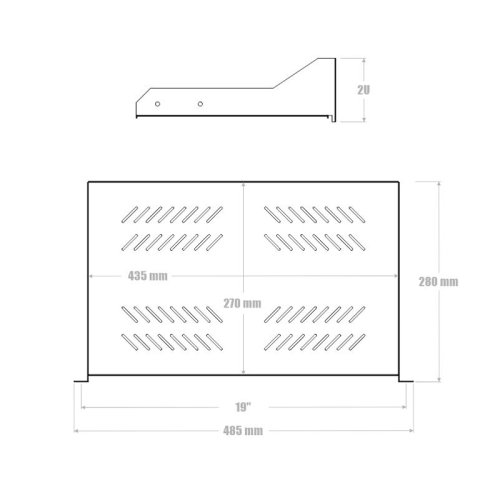 Polička s perforáciou 19" 2U 280 mm - 19" nízkoprofilová polica 280 mm s uchytením 2U je vhodná pre umiestnenie do 19" dátového rozvádzača s hĺbkou 400 mm a hlbšou. - Perforované telo police umožňuje prúdenie vzduchu. - Táto polica sa inštaluje iba na prednej vertikálnej lišty dátového rozvádzača. TECHNICKÉ VLASTNOSTI Celková hĺbka police: 280 mm Výška uchytenia v rozvádzači: 2U Rozmer úložnej plochy police: (š) 435 mm x (h) 270 mm Max. nosnosť police: 20 kg Rozmery: (v) 100 mm x (š) 510 mm x (h) 300 mm Hmotnosť: 1,64kg Súčasťou balenia je príbal na uchytenie v rozvádzači: 4x klietková matica M6, 4x skrutka M6