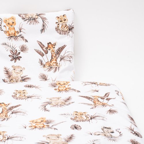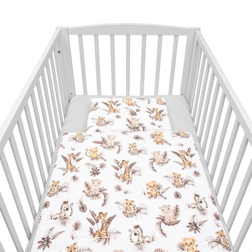 Detská 2-dielna súprava do postieľky New Baby Safari je produktom českej značky New Baby. Súprava je vyrobená zo 100% bavlny. Kvalitné prevedenie a nádherný dětský motív. Obsahuje obliečky na vankúšik cca 40x60 cm + obliečky na perinku cca 120x90 cm. Materiál 100% bavlna.<BR>Tieto výrobky sú bezpečné, pretože:<BR>- prírodná bavlna nespôsobuje odreniny a podráždenie, pretože neobsahuje formaldehydy a ďalšie prvky, ktoré dojčatám škodia<BR>- nestráca farbu a nezafarbuje oblečenie<BR>- ponúkané vzory sú príjemné na pohľad a majú upokojujúce farby - zipsy používané pri obliečkach sú tzv. "bezpečné zipsy" bez voľne visiacej koncovky, ktorú by mohlo dieťa odtrhnúť a prehltnúť<BR>- nie sú použité žiadne gombíky ani žiadne ďalšie plastové alebo oceľové časti, ktoré môžu byť pre Vaše dieťa nebezpečné<BR>- materiál, ktorý je používaný na výplne vankúšov a prikrývok, je 100% protialergický, čo znamená, že sa v jeho vláknach nešíria žiadne mikroorganizmy ani pleseň OEKO-TEX STANDARD 100.
