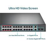 POPIS Switch ponúkajúci 24x Fast Ethernet RJ-45 porty s podporou PoE+ a celkovým napájacím výkonom až 250 W. Ďalej ponúka dva GbE RJ-45 porty a dva Gbit SFP sloty. Prenos dát a napájanie až do vzdialenosti 250 mv režime "Extend Mode", ktorý je špeciálne navrhnutý pre dohľadový systém. Prioritný režim pre porty 1-8 zaručuje kvalitu prenosu citlivých aplikácií, ako je napríklad video monitor. Jednoduché použitie bez nutnosti konfigurácie a inštalácie (Plug and play). Prepínacia kapacita dosahuje až 8,8 Gbps a rýchlosť smerovania až 6,55 Mpps. Buffer má kapacitu 4,1 Mb, tabuľka MAC adries 8 K a podporované sú Jumbo Frame 10 KB.