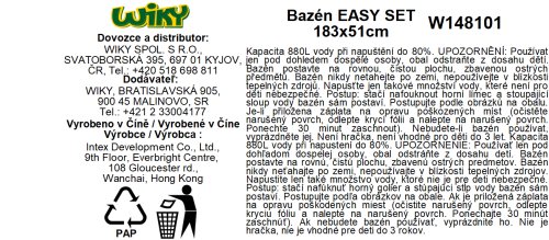 Samonosný bazén. Rozmery 183 cm (horný obvod 145 cm) x 51 cm. Výška hladiny 41 cm. Kapacita 900 L.