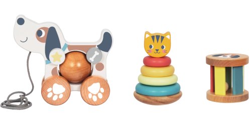 S touto sadou zábavných motorických hračiek sa Vaše dieťa rozhodne nudiť nebude! Psík na povrázku sa stane nerozlučným kamarátom každého dieťaťa pri jeho prvých samostatných krôčikoch a prechádzkach. Valec pri otáčaní vďaka guličke vo vnútri vydáva hrkavý zvuk a stimuluje tak sluch. A vďaka nasadzovacím krúžkom na tyč s motívom mačičky si deti precvičia jemnú motoriku, koordináciu ruka oko a učia sa rozpoznávať farby. Hračky sú vyrobené z dreva s certifikáciou FSC® a opatrené netoxickými farbami v jemných odtieňoch v kombinácii s farbou prírodného dreva. Hlavné vlastnosti: sada 3 hračiek rozvíja jemnú motoriku a koordináciu ruka-okoučej rozpoznávať farby vyrobené z dreva s certifikáciou FSC® vhodné ako darček od 1 roku veku ktorom sú dodržiavané prísne environmentálne a sociálne požiadavky. Značka FSC® na výrobku znamená, že svojim nákupom pomáhate chrániť lesy a podporujete šetrné, zodpovedné či prírode blízke hospodárenie, vďaka ktorému sú naše lesy stabilnejšie, zdravšie, majú prirodzenú druhovú skladbu a lepšie odolávajú negatívnym následkom klimatických zmien.