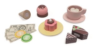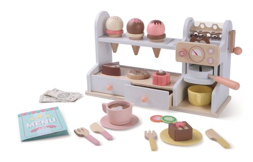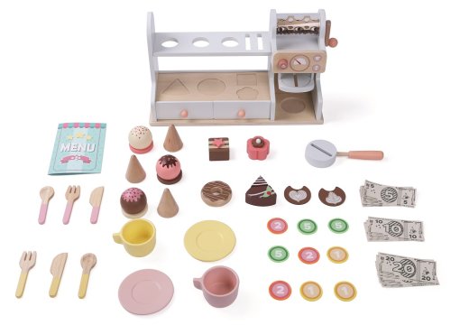 Staň sa skutočným baristom či obchodníkom! Chcete zmrzlinu, tortu alebo len lahodnú kávu? S touto 46-dielnou sadou si užijete hodiny zábavy. Sada ponúka šálky s podšálkami, príbory a lyžice, pultík s kávovarom, vitrínou s tortičky a poličkou s diery na zmrzliny. Nechýbajú ani zásuvky s úložným priestorom pre peniaze, ktoré sú taktiež súčasťou tejto sady. Hračky na hranie rolí popúšťajú v deťoch fantáziu a inšpirujú ku kreatívnej hre, čo má priaznivý vplyv aj na ich slovnú zásobu a rozvoj jazyka. Hlavné vlastnosti: obsahuje 46 dielovpodporuje rozvoj jazyka a slovnej zásoby