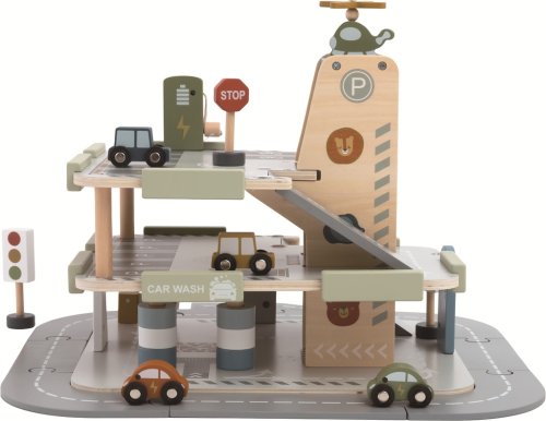 Všetkým automobilovým nadšencom sa rozžiaria oči, až uvidia garáž s cestou, výťahom a heliportom. Umiestnite dopravné značky, pripravte svoje autíčka a hra môže začať. Umyte svoje vozidlo v auto-umývačke. Natankujte pohonné hmoty pri stojane na prízemí. Máte elektro auto? Žiadny problém, vyvezte svoje vozidlo pomocou výťahu a pripojte ho k nabíjačke na druhom poschodí. Batéria je plná? Tak môžete vyraziť. Stala sa nehoda? Z heliportu na streche už štartuje vrtuľník. Táto edukatívna hračka motivuje deti ku kreatívnej a predstavivej hre. Rozvíja koordináciu ruka-oko, jemnú motoriku a zručnosť. Garáž s parkovacími plochami na troch úrovniach obsahuje aj cestu, 4 autíčka, helikoptéru a 3 dopravné značky . Hlavné vlastnosti: 3 podlažiagaráž s cestou, heliportom a výťahom, 4 autíčka, auto-umývačka, 2 tankovacie stojany (z toho 1 elektro), vrtuľník, 3 dopravné značkyinšpiruje ku kreatívnej a predstavivej hrerozvíja koordináciu ruka-oko, jemnú motoriku a zručnosťvhodné