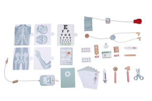 Hra s touto sadou je nielen skvelou zábavou, ale aj učením. Deti sa učia empatiu, zbaveniu sa strachu, zodpovednosti i starostlivosti o druhých. Táto hračka podnecuje predstavivosť, umožňuje objavovať tajomstvo povolania lekára a učí rozpoznávať nástroje potrebné na túto prácu. Hra navyše formuje manuálne zručnosti. Poznáte výšku svojho pacienta? Nie? Potom ho zmerajte! Zmerajte mu aj tlak alebo teplotu, vypočujte si ho a všetko dôkladne zapíšte do karty pacienta. Môžete tiež skontrolovať zrak či sluch a nezabudnite sa pozrieť na röntgenové snímky na funkčnej podsvietenej doske! Sada obsahuje stôl na vyšetrenie a zákroky s úložným priestorom a nástroje nevyhnutné pre prácu lekára. Stetoskop, tlakomer, teplomer, pinzetu, krabičky na lieky a krémy, nožnice, infúziu, 4 RTG snímky, otoskop, injekčnú striekačku, kladivko, karty pacientov, kartičky s liekmi, tabuľku na kontrolu zraku a informatívne letáčky . Hlavné vlastnosti: obsahuje 30 ks drevená nemocnica s príslušenstvom pomáha s rozvojom predstavivosti, reči a sociálnych zručností zdokonaľuje komunikačné a motorické zručnosti rozvíja fantáziu a kreativitu funkčná doska na podsvietenie RTG snímok - 2xAAA batéria nie je súčasťou balenia