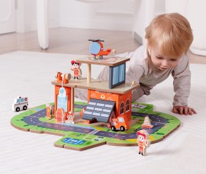 2Kids Toys Drevená stanica Hasiči 2 v 1. Hasičská stanica a Auto. Priprav sa na akciu! Tento unikátny výrobok spája dve obľúbené detské hračky do jedného úžasného zážitku. Detailná hasičská stanica ponúka výjazdové vráta, cestu, riadiace centrum, parkovacie miesta, záchranárske vybavenie pripravené na každú núdzovú situáciu, figúrky hasičov, vozov, psa a ďalšie. Potrebujete stanicu premiestniť inam? Potom ju zložte a premeňte na štýlové hasičské auto, ktoré môže okamžite vyraziť na miesto požiaru! Ideálna hračka pre malých hrdinov, ktorí milujú dobrodružstvo, stavanie a záchranu! Hlavné vlastnosti: podnecuje fantáziu rozvíja jemnú motoriku učí deti tímovej spolupráci auto aj hasičská stanica v jednom obsahuje 13 dielov
