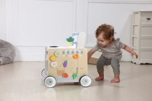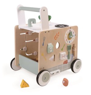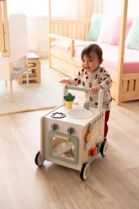 Drevené chodítko od 2Kids Toys je hravý pomocník pre prvé krôčiky aj kulinárske dobrodružstvo! Objavte čarovné spojenie kuchynky a chodítka v jednom! Tento multifunkčný drevený pomocník nielen podporí Vaše dieťa pri jeho prvých krokoch, ale zároveň rozvinie jeho fantáziu a jemnú motoriku. Ideálna hračka pre malé kuchárky a kuchárov, ktorí práve objavujú svet! Chodítko ponúka aj úložný priestor na hračky alebo kuchynské náčinie. Navyše otočné gombíky na rúre vydávajú cvakavý zvuk! Na štyroch stranách chodítka nájdete hry ako vkladanie tvarov (potravín), otáčanie ozubených koliesok, zeleninový labyrint, rúru s platničkou alebo drez s batériou. Chodítko má pogumované kolesá a je tak tiché a zároveň bezpečné. Dvierka rúry sú otvárateľné. Robustná konštrukcia z dreva so stabilným rámom zaisťuje bezpečnosť pri chodení a dlhú životnosť. Hlavné vlastnosti: interaktívne kuchynské doplnky podporujúce kreatívny hrudesign vhodný pre deti spája radosť z hry s učením pohybupodnecuje hru, koordináciu ruka-okonapomáha s rovnováhouvhodné ako darček pre batoľa