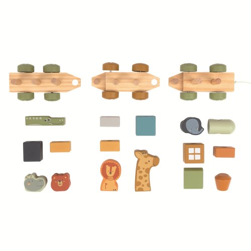Nasadzovacia hra v tvare vláčika s lokomotívou a 2 vagónikmi, ktorý vezie roztomilé zvieratká, je skvelou pomôckou pre rozvoj jemnej motoriky a logického myslenia detí. Na drevených podvozkoch sú umiestnené tyče, na ktoré deti nasadzujú kocky rôznych tvarov a stavajú tak farebný vláčik. Súčasťou sú aj kocky v tvare zvieratiek - žirafa, slon, medveď, lev, hroch a krokodíl. Vďaka pripojenej šnúrke môžu deti vláčik prevážať aj so zvieratkami a využiť ako ťahaciu hračku. Pri hre si deti precvičujú koordináciu ruka-oko, zlepšujú úchop a presnosť pohybu, čo prispieva k celkovému rozvoju motorických zručností. Nasadzovanie tvarov na správne miesta podporuje koncentráciu, trpezlivosť aj schopnosť riešiť jednoduché úlohy. Deti sa tiež učia rozpoznávať a pomenovať farby a zvieratká, čo podporuje zrakové vnímanie a jazykový rozvoj. Táto didaktická hračka je vhodná pre malé deti od 1,5 roka a ponúka zábavnú formu učenia prostredníctvom hry. Hlavné vlastnosti: 19 dielov rozvíja motorické zručnosti a koordináciu ruka-okopodporuje koncentráciu a trpezlivostučí rozpoznávanie farieb, tvarov a pomenovanie zvieratvhodné od 1,5 roka