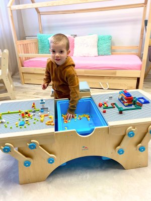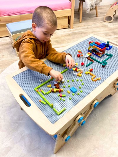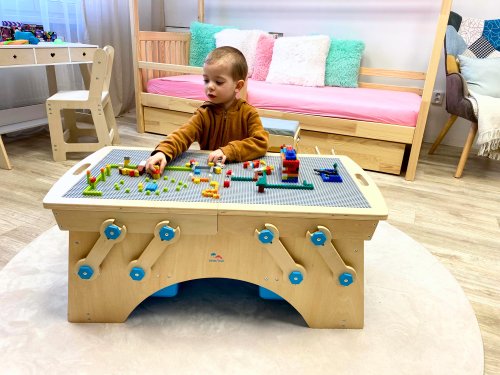 Tento drevený hrací stôl pre deti s úložnými boxmi a so stavebnicou je ideálnou voľbou pre deti, ktoré milujú stavanie, kreatívne hranie a organizovaný priestor! Stôl je navrhnutý tak, aby bol bezpečný a prístupný pre deti od 3 rokov. Tento hrací stôl so stavebnicou ponúka praktický a zábavný priestor pre deti, podporuje ich kreativitu a jemnú motoriku. Vďaka kompatibilite so stavebnicami ostatných výrobcov si deti môžu stavať ľubovoľné modely a rozvíjať svoju fantáziu. Stôl je dodávaný s detailným návodom na montáž. Hlavné vlastnosti: úložný priestor a vysúvacie priehradky pre kocky a diely stavebnicstavebnice je súčasťou herného stola - obsahuje 500 ks stavebných kociekkompatibilný s kockami a stavebnicami značiek Lego, Qman, Sluban, LW a ďalšímibezpečný dizajn so zaoblenými hranami a držadlami pre ľahké a bezpečné odloženie kombinácia dreva, plastu a kovudva samostatné stavebné a herné povrchy, pod ktorými sa nachádza priestranný úložný boxdva bočné úložné boxy pre diely alebo celé stavby, vyberateľné a ľahko umývateľné