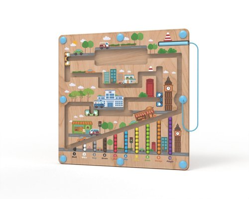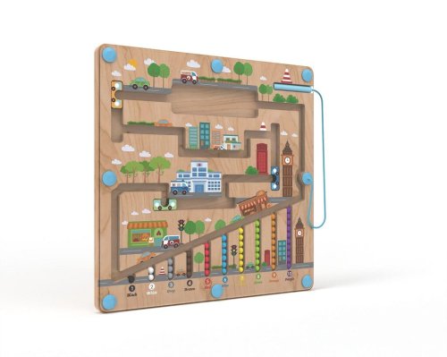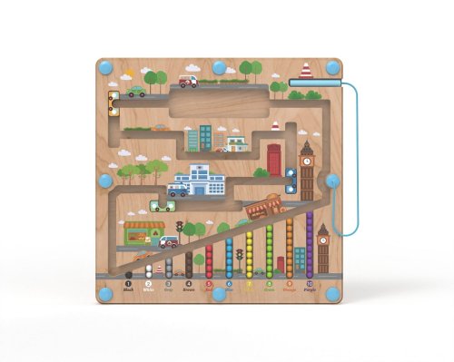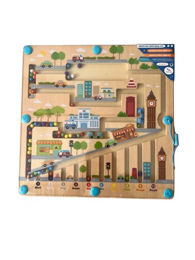 Vydajte sa na cestu mestom s farebnými guličkami. Vykonáte úspešne rôznofarebné guličky všetkými zákutiami? Na prevoz Vám pomôžu farebné autobusy. Na vedenie guličiek sa pri hre využíva magnetické ukazovátko, ktoré preverí detskú trpezlivosť a koordináciu rúk a zraku. Dokážete potom navrátiť guličky späť na svoje miesto podľa farby? Zábavná drevená hra, ktorá pomáha deťom rozvíjať jemnú motoriku, orientovať sa v priestore a rozširovať slovnú zásobu pomenovávaním farieb a predmetov v meste. Deti sa tiež učia základy počtov formou hry. Drevená základňa v dizajne mesta je krytá odolnou priehľadnou plastovou doskou, hračka je vďaka tomu bezpečná. Hlavné vlastnosti:•úvod do sveta počtov•rozvíja motorické zručnosti detí•zábavné aj bezpečné vďaka magnetickému princípu