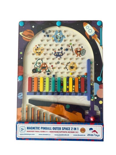 Originálna drevená hra s vesmírnym motívom ponúka deťom hneď dve možnosti, ako si užiť veľa zábavy: klasický pinball s vystreľovaním guličiek a magnetickú hru so zbieraním bodov. Farebná hracia doska je navrhnutá tak, aby podporovala zručnosť, sústredenie a trpezlivosť. Pomocou vystreľovača (katapultu) sa hráči snažia dostať magnetické guličky čo najpresnejšie do vybraných polí a získať čo najviac bodov. Prehľadné usporiadanie hracej plochy umožňuje ľahké sledovanie výsledkov a zároveň deti učia počítať body. Vďaka praktickému stojanu je možné hru pohodlne postaviť na stole. Zábavná hra, ktorá rozvíja postreh, jemnú motoriku a logické myslenie. Ideálne pre samostatné hranie alebo zábavné súťaženie s kamarátmi a rodičmi i.