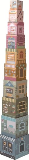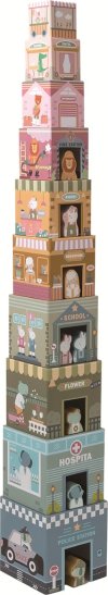 Skladanie je zábava! Táto drevená veža v jemných pastelových farbách sa skladá z 10 kociek rôznych veľkostí, ktoré deti môžu stavať na seba ako vysoký mrakodrap alebo rozložiť vedľa seba ako mestečko. Každá kocka predstavuje inú mestskú budovu. Nájdete tu nemocnicu, školu, kníhkupectvo, kvetinárstvo aj supermarket. Na stranách kociek sú detailné ilustrácie budov a 6 kociek má aj okienko, kde si deti môžu schovať drevené figúrky, roztomilé zvieracie postavičky, ktoré predstavujú rôzne povolania. Viete, do ktorého domčeka patrí slon, psík alebo lev? Vďaka skladaniu, triedeniu a hraniu si deti rozvíjajú motoriku, logiku, kreativitu i porozumenie tvarom, farbám a roliam v meste. Veža sa dá ľahko skladať a rozkladať a vďaka tomu je ideálna nielen na doma, ale aj na cesty. Poslúži tiež dobre ako kulisy, rozvíja fantáziu detí a povzbudzuje k predstavivej hre. Či už ako veža alebo kulisy k hre, hračka prináša nekonečné možnosti zábavy! Hlavné vlastnosti: 18 dielov (10 kociek a 8 figúrok)6 kociek s okýnkylze postaviť ako veža alebo rozložiť ako mestotematické budovy: škola, nemocnica, kvetinárstvo, kníhkupectvo, obchod a ďalšierozvíja jemnú motoriku, logické myslenie a fantáziipovzbudzuje k predstavivé hrev1