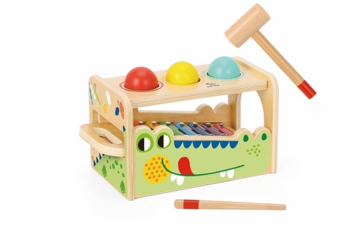 Podporte záujem o hudbu u svojich detí! Xylofón a zatĺkacia hračka 2 v 1 sú dve samostatné, ale prepojené hračky, ktoré ponúkajú deťom možnosť objavovať rytmus a zvuky a súčasne rozvíjať motorické zručnosti. Roztomilý krokodíl vyrobený z odolného dreva s integrovaným xylofónom je dvakrát zábavnejší. Tri drevené gule po údere kladivka prepadnú otvormi v hornej časti a vytvárajú zvuky na xylofóne, keď naň dopadnú. Xylofón s farebne odlíšenými klávesmi je možné vybrať a hrať na ňom samostatne pomocou drevenej paličky. Hračka je vyrobená z dreva s certifikáciou FSC® vo farebnej kombinácii jemných odtieňov s farbou prírodného dreva. Nejedná sa o hudobný nástroj, ale iba o hračku. Hlavné vlastnosti: úvod do sveta zvukov a rytmurozvíja obratnosť a uchopovacie zručnostivyrobené z dreva s certifikáciou FSC®vhodné od 1 roku veku environmentálne a sociálne požiadavky. Značka FSC® na výrobku znamená, že svojim nákupom pomáhate chrániť lesy a podporujete šetrné, zodpovedné či prírode blízke hospodárenie, vďaka ktorému sú naše lesy stabilnejšie, zdravšie, majú prirodzenú druhovú skladbu a lepšie odolávajú negatívnym následkom klimatických zmien.