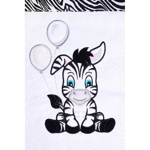 Detská bavlnená 3-dielna súprava do postieľky New Baby Zebra pre bábätká. Súpravu zdobí veselý obrázok zebry s pruhmi a je celopotlačená výraznými čiernobielymi pruhmi. Je vyrobená z mäkkého, príjemného materiálu. Súprava obsahuje obliečky na vankúšik cca 40x60 cm, obliečky na perinku cca 100x135 cm a mantinel cca 180 cm. Materiál 100% bavlna.<BR>Tieto výrobky sú bezpečné, pretože:<BR>- prírodná bavlna nespôsobuje odreniny a podráždenie, pretože neobsahuje formaldehydy a ďalšie prvky, ktoré dojčatám škodia<BR>- nestráca farbu a nezafarbuje oblečenie<BR>- ponúkané vzory sú príjemné na pohľad a majú upokojujúce farby - zipsy používané pri obliečkach sú tzv. "bezpečné zipsy" bez voľne visiacej koncovky, ktorú by mohlo dieťa odtrhnúť a prehltnúť - nie sú použité žiadne gombíky ani žiadne ďalšie plastové alebo oceľové časti, ktoré môžu byť pre Vaše dieťa nebezpečné - materiál, ktorý je používaný pre výplne vankúšov a prikrývok, je 100% protialergický, čo znamená, že sa v jeho vláknach nešíria žiadne mikroorganizmy ani pleseň.