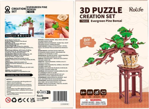 Dá sa veľa práce starať o rastliny, aby neuvädli a dobre sa im darilo. To ale nie je prípad bonsaje vždyzelenej borovice. Nemusíte ju zalievať, nemá žiadne špeciálne nároky na svetlo a napriek tomu je stále krásna a ozdobí Váš domov či kanceláriu. Bonsai je umiestnená na vysokom, jemne vyrezávanom stojane inšpirovanom Japonskom a zasadená do kvetináča, v ktorom vrstvy skladačky vytvárajú štruktúru popraskanej pôdy. Samotný stromček má prepletené vetvy a štruktúrované listy, ktoré napodobňujú silu a vytrvalosť vždyzelených stromov. Do Vášho domova alebo kancelárie prinesie pripomienku diaľok a vytvorí pokojnú a inšpirujúcu atmosféru ru.<br> ; <br> Táto 3D skladačka je skvelým spôsobom, ako si užiť kreatívne a edukatívne hranie a zároveň vytvoriť nádherný model, ktorý sa môže stať netradičným darčekom či ozdobou interiéru. Skladanie skladačky podporuje rozvoj jemnej motoriky, priestorového myslenia a trpezlivosti. Pozvite svoju rodinu alebo priateľov a užite si zábavné tvorenie bez nutnosti použitia lepidla alebo nástrojov. Všetky dieliky sú presne vyrezané, a ľahko do seba zapadnú, aby výsledok bol stabilný a odolný. Skladačka je dodávaná v nezloženom stave, zabalená v krabici s podrobným návodom na zostavenie.<br> <br> Hlavné vlastnosti: 115 presných dielikov doba zostavenia 1 hod. > podrobný návod na zostavenie je súčasťou balenia<br> <br> Rozmery balenia: 22,9 x 15,4 x 1 cm<br> Rozmery po zostavení: 20 x 10,5 x 23,1 cm<br> Vek: 14+<br> Materiál: drevo<br> Počet dielikov: 115<br> Doba se
