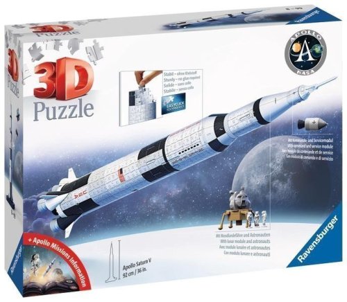 Fascinuje vás vesmírny program? Zažite jedinečnú kombináciu skladania a stavania a vytvorte si jedinečný 3D Puzzle model vesmírnej rakety Apollo Saturn V zo 432 kvalitných plastových dielikov. Svetovo preslávená raketa misií Apollo ako pôsobivé 3D puzzle v celkovej výške takmer 1 metra vás úplne ohromí. Súčasťou tohto 3D Puzzle modelu sú tiež oddeliteľné raketové stupne, lunárny pristávací modul, veliteľský modul a 3 figúrky astronautov. Ako súčasť balenia tiež nájdete podrobné informácie o misiách Apollo a prvom pristátí na Mesiaci a podstavec pod raketu. Kvalitné, plastové 3D puzzle s patentovanou technológiou EasyClick. Bez nutnosti lepenia!