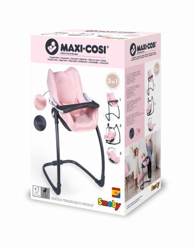 Autosedačka Maxi-Cosi 3 v 1 pre bábiky. Pri zavesení sedačky na konštrukciu je razom hojdačka pre bábiku do veľkosti 42 cm. Otočením konštrukcie získate vysokú jedálenskú stoličku s pultíkom. Rozmery: 43 x 72 x 41 cm. Hmotnosť 2,31 kg.