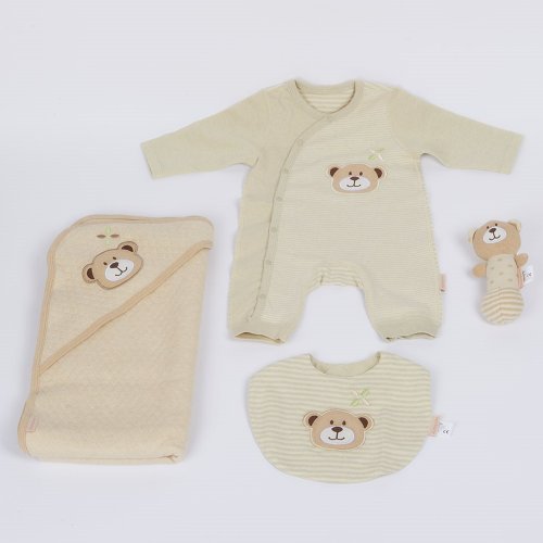 Krásny darčekový set z organickej bavlny českej značky New Baby. Set sa skladá z overálku, podbradníka, dečky s kapucňou a hračky. Všetky časti sú zdobené nášivkou medvedíka. Dojčenský overálek bez šľapiek ukončený pružným lemom má bočné zapínanie na cvočky po celej dĺžke. Podbradník je možné zapnúť do 2 veľkostí. Zapínanie je na 2 cvočky. Dečka s kapucňou je veľmi príjemná na dotyk a praktická kapucňa chráni hlavičku dieťatka pred chladom. Po celom obvode má dečka kvalitné lemovanie. Možno využiť aj ako osušku. Hračka s hrkálkou a pískatkom priláka pozornosť dieťaťa, učí ho, baví a rozvíja tak detskú fantáziu. Vhodné pre deti od prvých dní života. Nádherný a kvalitný set je dodávaný v prútenom košíčku, štýlovo zabalený tylovou tkaninou a mašľou, ktorá všetko luxusne podčiarkne. Set je vhodný aj ako milý darček.