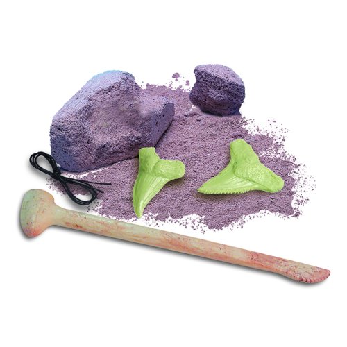 Obsahuje 2 žraločie zuby svietiace v tme zaliate do sadrového bloku, špeciálny nástroj, povrázok a inštrukcie.