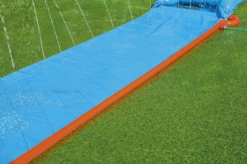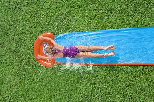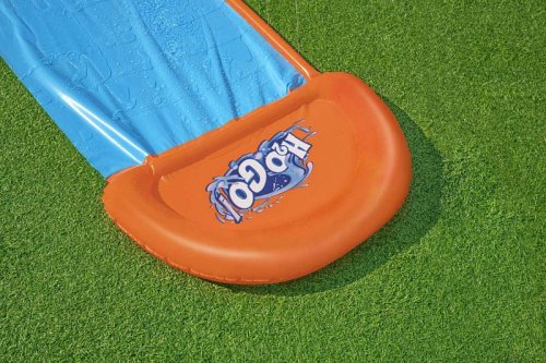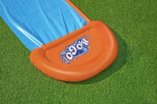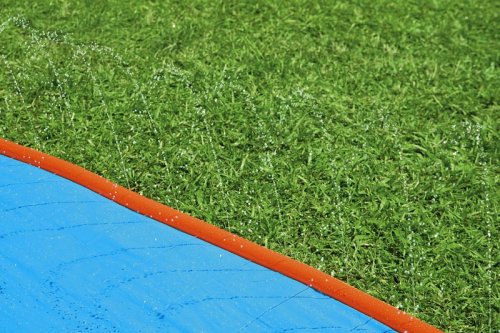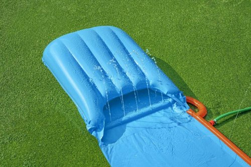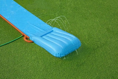 Pripojte sa pomocou adaptéra k záhradnej hadici a jazda začína. Takmer päťmetrová šmykľavka je ideálna na pretekanie s kamarátmi.