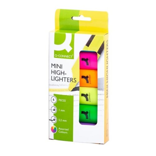 Súprava mini zvýrazňovačov Q-Connect, 6 neónových farieb Praktické kompaktné zvýrazňovače Vhodné pre väčšinu papierov a na faxovom papieri nevybledne Farby: žltá, zelená, oranžová, modrá, ružová, fialová Šírka …