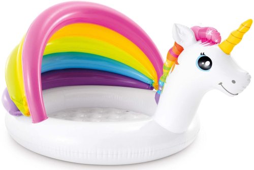 Bazén so strieškou jednorožec. Rozmery 127 x 102 cm. Kapacita 45 L pri výške hladiny 13 cm.