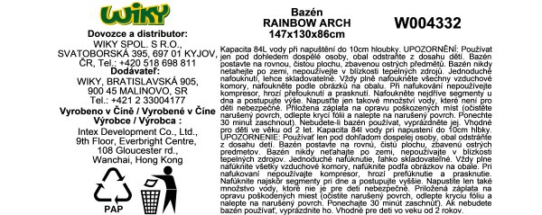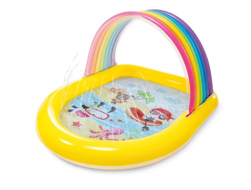 Bazén s dúhou as rozprašovačom vody. Veľkosť 147 x 130 x 86 cm, 0,25 mm vinyl, objem 84 l pri výške hladiny 10 cm, opravný set