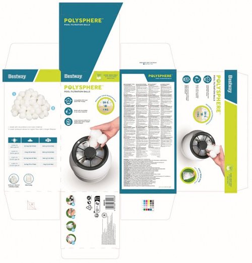 Filtračné gule Bestway® Flowcear™ Polysphere Pool sú vysoko efektívne a šetrné k životnému prostrediu. Udržujú čistú vodu v nadzemných bazénoch. Polyshperes vyzerajú ako bavlnené guličky, ale nenechajte sa oklamať. Flowclear Polyspheres ponúka niekoľko výhod a je možné ich použiť vo všetkých existujúcich pieskových filtráciách Bestway. Zvyšujú účinnosť vašej pieskovej filtrácie znížením tlaku, čo umožňuje vyšší prietok a dlhšiu životnosť produktu. Polysféry sú vyrobené z ľahšieho materiálu. V skutočnosti sa 500 gramov polysféry rovná 18 kilogramom piesku. Ponúkajú vynikajúcu filtráciu. Priezračné a čisté vody je dosiahnutá za kratšiu dobu. Polyspheres sú vyrobené zo 100% recyklovateľného a netoxického PET materiálu. Jednoduché ručné pranie. Flowclear. Množstvo náplne je nasledovné: Pieskový filter hmotnosť pri použití piesku/hmotnosť pri použití náplne Flowclear™ Polysphere: Bestway® 2 006 l/h, 8,5 kg, 240 g. Bestway® 3785 l/h, 18 kg, 500 g. Bestway® 5 678 l/h, 25 kg, 700 g. Bestway® 7 571 l/h, 35 kg, 1000 g. Poznámky: Náplň FlowclearTM Polysphere môžete použiť aj s inými pieskovými filtráciami, 28 g náplne FlowclearTM Polysphere nahradí 1 kg piesku. Jednoduché prenášanie, manipulácia a preprava. Nízka hmotnosť pre ľahkú manipuláciu. Vynikajúce výsledky a účinnosť filtrácie. Dlhá životnosť. Funkcia protiprúdu pieskového filtra Bestway® nie je možná. Jednoduchá likvidácia, netoxické. Obsahuje: 500 g Flowclear™ Polysphere. Rozmer balenia: 17,6 x 36,6 x 17,6 cm. Hmotnosť balenia: 0,78 kg.