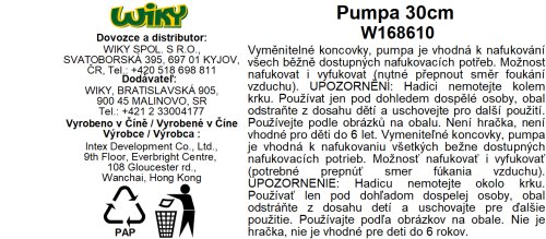 Robustná vzduchová pumpa INTEX o veľkosti 32 cm je vhodná na nafukovanie aj vyfukovanie nafukovacích výrobkov. Súčasťou balenia je flexibilná hadica vrátane 3 rôznych tryskových nástavcov.