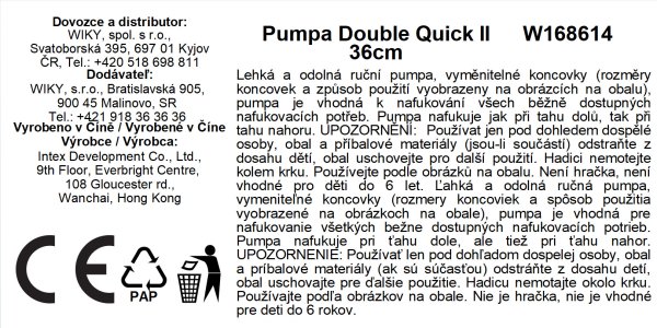 Pumpa ručná dvojkomorová. Pumpa je dlhá 36 cm a má 3 spojovacie trysky, ktoré sú určené pre malé, stredné aj veľké nafukovacie ventily. Vďaka nej tiež ľahko vypustíte vzduch opačným koncom jej nadstavca. Univerzálne pripojenie na ventil umožňuje nafukovať nielen bazény, ale aj matrace, člny, lopty a ďalšie. Vhodné od 6 rokov.