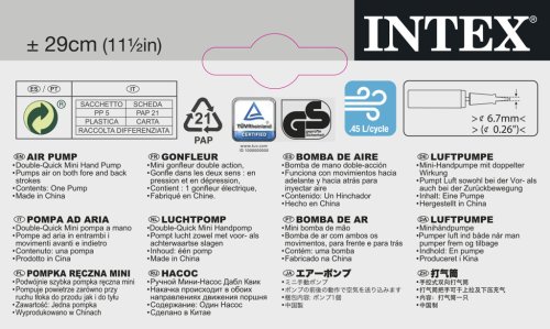 Prenosná ručná mechanická vzduchová mini pumpa. Pumpuje vzduch pri ťahu nahor aj pri pohybe dole Flexibilná hadička s 3 násadami je použiteľná pre väčšinu ventilov. Vhodná na fúkanie malých bazénikov, lôpt, rukávov a ďalších menších nafukovacích potrieb. Vhodné od 3 rokov.