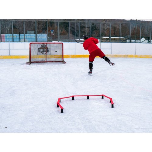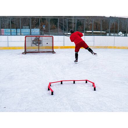 Merco 7 Section Stickhandling je tréningová pomôcka, ktorá slúži na nácvik a zlepšovanie stickhandlingu – práca s hokejkou. Môžete ho používať na ľade aj mimo neho, napríklad na streleckej doske Shooting Pad. Trenažér je vyrobený z odolného PP materiálu a je zložený zo siedmich častí, ktoré je možné ľubovoľne natočiť a vy si tak nastavíte dráhu podľa ľubovôle. Dĺžka jednej časti je 45,5 cm, dĺžka medzi základňami 35 cm, výška je 10 cm a celková hmotnosť je 1,05 kg. Vďaka nízkej hmotnosti a rozmerom po zložení (46 x 25 x 11 cm) je ľahko prenosný a môžete ho tak pridať do tašky k ostatným veciam na tré nink. Spestrite si svoj tréning a zlepšujte neustále svoje hokejové schopnosti a prácu s hokejkou!