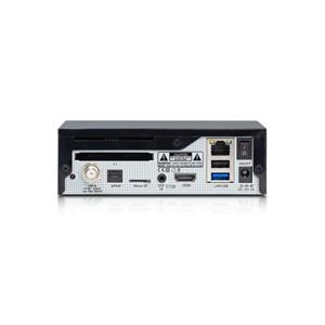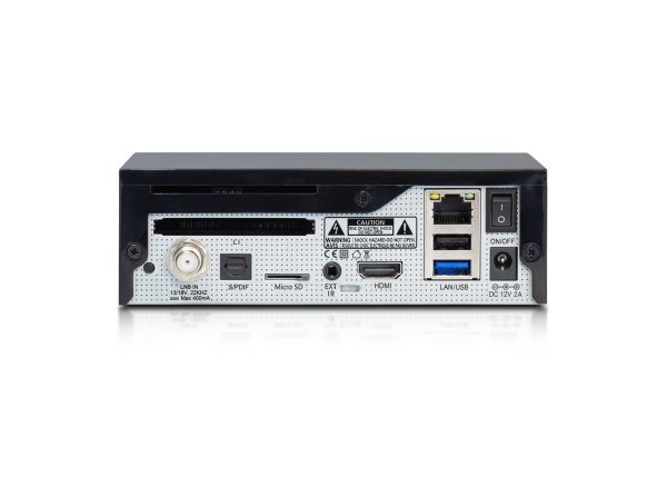Elegantný a minimalistický dizajn prijímača sa bude hodiť do každej obývačky. Na prednom panely sa nachádza LED stavová dióda, ktorá signalizuje či je prijímač zapnutý, vypnutý alebo v stand-by režime. Intenzitu si viete nastaviť, prípadne úplne vypnúť. Na zadnom panely sa nachádza vstavaný satelitný tuner DVB-S2X, 1x slot pre čítačku kariet, 1x slot pre CI modul, 1x slot pre microSD kartu, 1x USB 3.0, 1x USB 2.0. Z konektorovej výbavy tu nájdete aj S/PDIF optický digitálny audio výstup, ethernet RJ45, IR extender pre pripojenie IR oka (nenachádza sa v balení prijímača), vypínač a vstup pre externý zdroj DC 12V-3A.