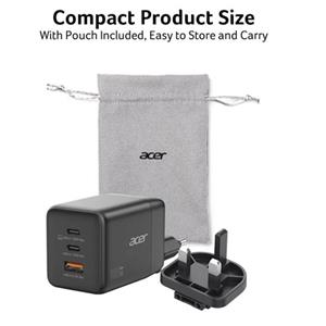 Acer 100W GaN charger - Black; 3 nabíjacie porty: 2x USB-C + 1x USB-A; podpora rýchleho nabíjania (protokoly PD3.0, PPS, Quick Charge, FCP, SCP); celkový výkon max. 100W; 1,5 m USB-C kábel; 41 x 45 x 66mm bez zástrčky; hmotnosť 228 g; EÚ a UK zástrčka; textilný obal; čierny; pre telefóny, tablety, notebooky