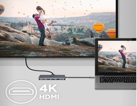 Docking Station 12v1 podporuje napájanie notebookov, vybavených podporou Display port over USB-C, a to s použitím zdroja USB-C s funkciou Power Delivery.