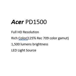 PD1500, LED, FHD (1920x1080), 1500 ANSI, 5000:1, HDMI, repro 1x5W, 2.3Kg, LumiSense, Acer Blue Light Shield, ColorSafe II, životnosť lampy 20 000h, 360st projekcia,