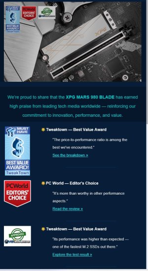 SSD disk MARS 980 BLADE Gen5 je prvý SSD disk PCIe 5.0 určený pre notebooky. Vďaka bleskurýchlemu sekvenčnému čítaniu/zápisu rýchlosťou až 14 000 / 10 000 MB/sa priestrannej kapacite 1 TB poskytuje dlhodobý a stabilný výkon pre náročné úlohy. Je plne kompatibilný s najnovšími platformami Intel a AMD a definuje novú éru rýchlosti a štýlového chladenia.