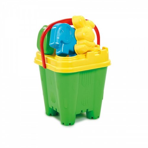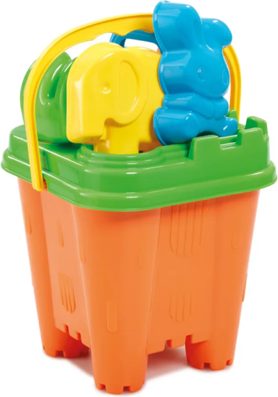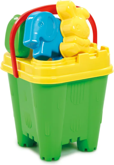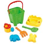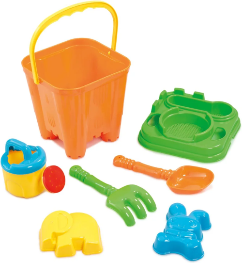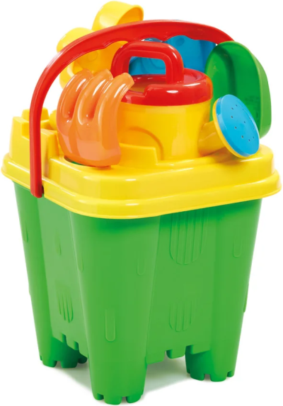 1 vedierko s odnímateľným vekom, ktoré slúži ako sitko, 1 kanva, 1 hrable, 1 rýľ, 2 formičky.