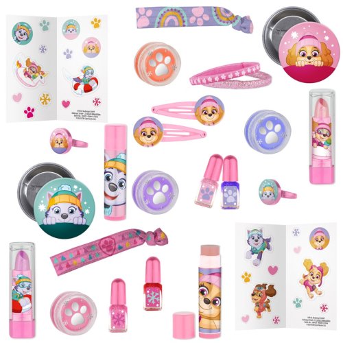 Adventný kalledár Tlapková patrola Winter Wonderland – kozmetický pre dievčatá. Obsahuje – 2× sponka do vlasov, 2× prstienok, 2× gumičku na ruku alebo do vlasov, 2× aršík so samolepkami, 2× mašľu do vlasov, 2× rúž, 2× balzam na pery, 4× lak na nechty, 4× tiene s trblietkami, 2×