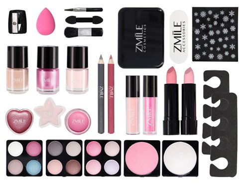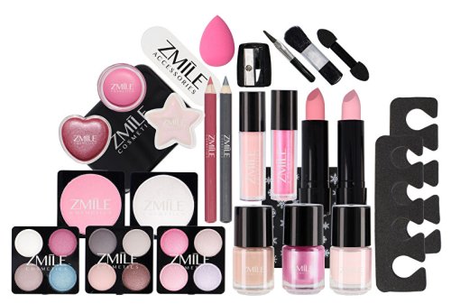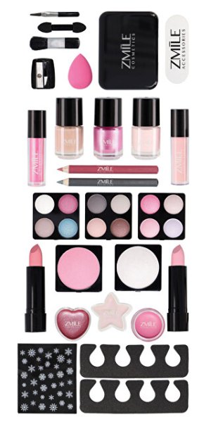 Paletka očných tieňov 3 ks Lak na nechty 3 ks Krémový lesk na pery 3 ks Rúž 2 ks Lesk na pery 2 ks Tvárenka 1 ks Rozjasňovač 1 ks Ceruzka na oči 1 ks Kontúrovacia ceruzka na pery 1 ks Mini hubka na ma nálepiek na nechty 1 ks Pilník na nechty 1 ks Znovuplniteľná krabička so zrkadielkom (na očné tiene alebo tvárenku) 1 ks Oddeľovač prstov na nohách 2 ks Sada štetcov a aplikátorov 3 ks