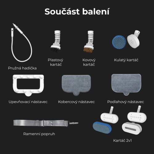 Príslušenstvo v balení: Ohybná hadica, plastová kefa, kovová kefa, okrúhla kefa, nadstavec na koberce, mop na koberce, mop na podlahu, kefa 2v1, ramenný popruh