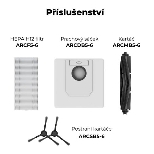 HEPA H12 filter ARCF5-6, Prachové vrecko ARCDB5-6, Hlavná kefa ARCMB5-6, Postranné kefy ARCSB5-6