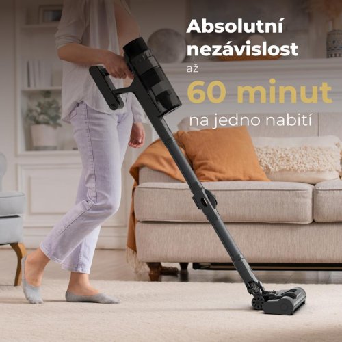 Nezastavujte upratovanie kvôli nabíjaniu. AENO SC2 batériový vysávač zvládne vysávať až 60 minút bez nabíjania. To je dostatok času na vysať domácnosť o veľkosti 70m2.