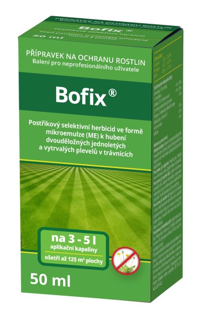 Známy a obľúbený selektívny herbicíd v trávnikoch. Prípravok Bofix je veľmi rýchly účinok viditeľný už po niekoľkých hodinách. 2 hodiny po aplikácii už môže pršať. Pôsobí na dvojklíčnolistové buriny: skorocel, púpava, hviezdica prostredná, konopnica, hluchavka, žihľava, pupenec, peniažtek, ostružník, ďatelina, špenát, pichliač roľný atď. Nepôsobí na trávy. Je vhodný aj pre mladých trávniky. 50 ml prípravku stačí na prípravu cca 2 - 5 l aplikačnej kvapaliny (na plochu cca 83 - 125 m2). Súčasťou balenia je odmerka.