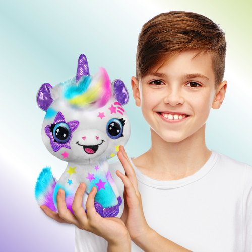 Airbrush štúdio. Súčasťou tohto balenia je plyšové zvieratko, airbrush nástroj, 3 rôzne farebné náplne, 120 rôznych šablón, plastové, ochranné rukavice a návod. Plyšové zvieratko si môžeš pomocou airbrusha ľubovoľne posprejovať, môžeš využiť aj samolepiace šablóny. Fantázii sa medze nekladú. Pokiaľ sa ti vytvorený dizajn prestane páčiť, stačí plyšáka umyť alebo vyprať (iba studenou vodou) a môžeš začať odznova. Výrobok je vhodný pre deti od 3 rokov a vyžaduje 2x AA batérie, ktoré nie sú súčasťou balenia.