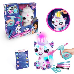 Navrhni a vyfarbi si svojho vesmírneho jednorožca Plyšové zvieratko si môžeš pomocou airbrush ľubovoľne posprejovať, môžeš využiť rôzne farby a šablóny Ak sa ti vytvorený dizajn prestane páčiť, stačí plyšáka umyť vodou a môžeš začať znovu Plyšákovi svieti roh