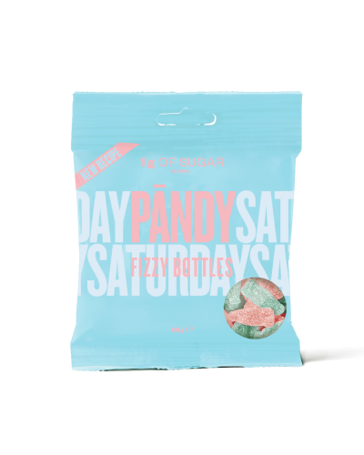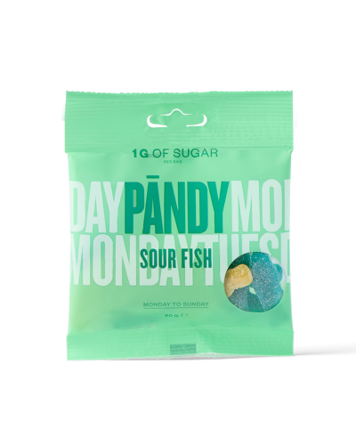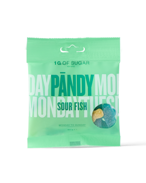 50 g (1 sáček) kyselé ovoce (Fizzy Bottles) kyselá kola (Sour Cola) borůvka-citron (Sour Fish) malina-hruška (Sweet Hearts)